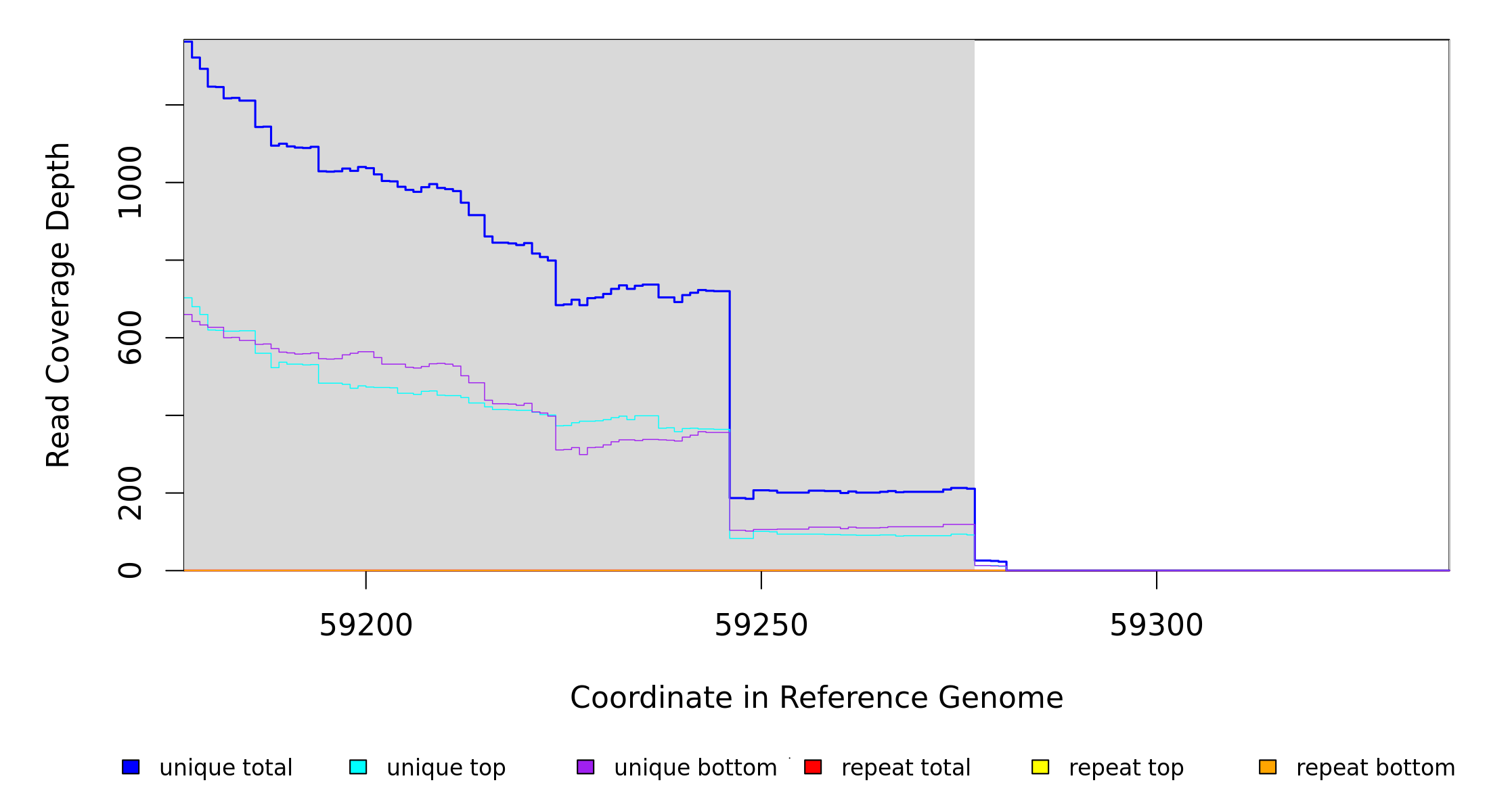 | seq id | start | end | size | ←reads | reads→ | gene | description | |||
