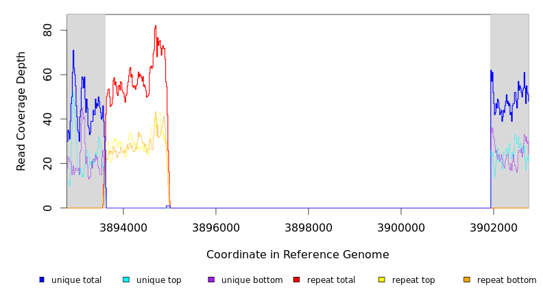 | * | ? | REL606 | = 3652533 | NA (NA) | 59 (1.250) | 47/146 | 0.0 | 100% | noncoding (1443/1443 nt) | IS150 | repeat region |