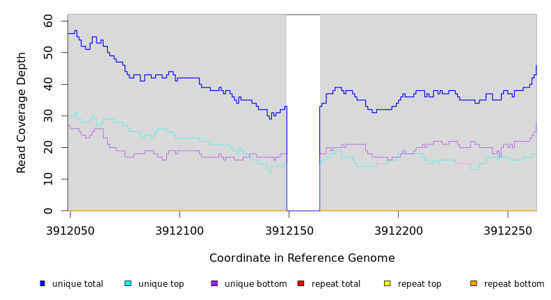 | seq id | start | end | size | ←reads | reads→ | gene | description | |||