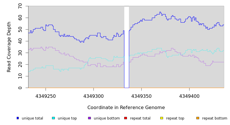 | seq id | start | end | size | ←reads | reads→ | gene | description | |||