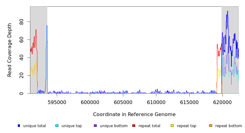 | seq id | start | end | size | ←reads | reads→ | gene | description | |||