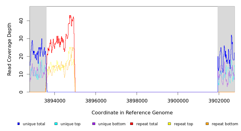 | * | ? | REL606 | = 3652533 | NA (NA) | 23 (1.070) | 20/146 | 0.2 | 100% | noncoding (1443/1443 nt) | IS150 | repeat region |