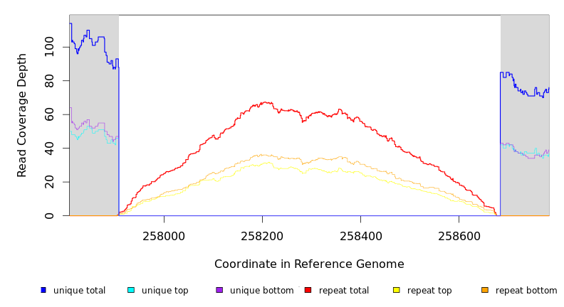 | seq id | start | end | size | ←reads | reads→ | gene | description | |||