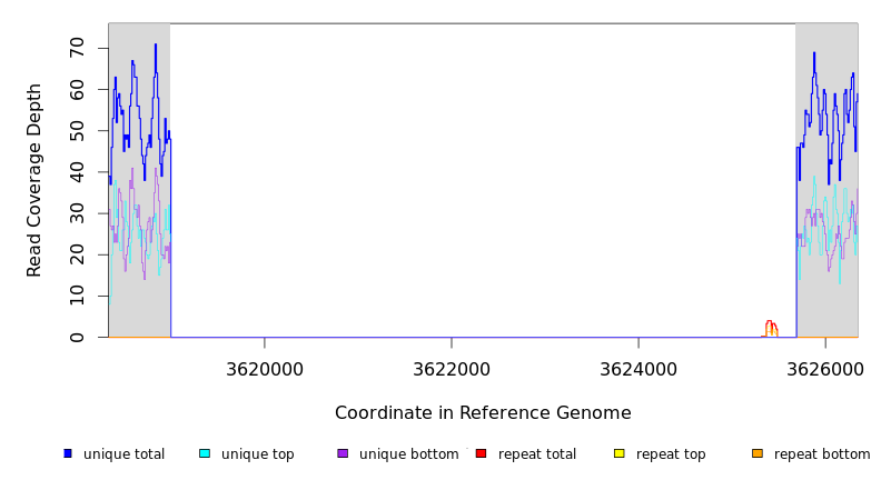 | seq id | start | end | size | ←reads | reads→ | gene | description | |||