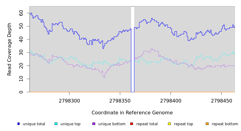 | seq id | start | end | size | ←reads | reads→ | gene | description | |||