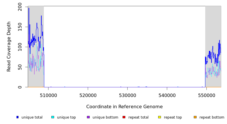 | seq id | start | end | size | ←reads | reads→ | gene | description | |||