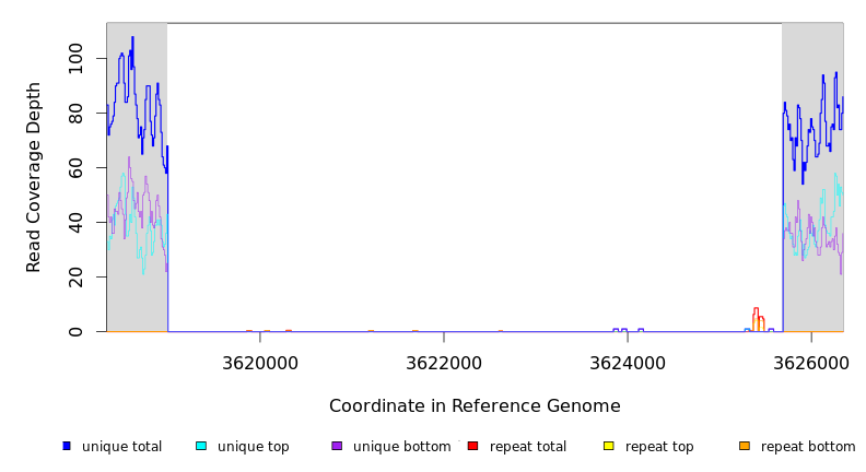 | seq id | start | end | size | ←reads | reads→ | gene | description | |||