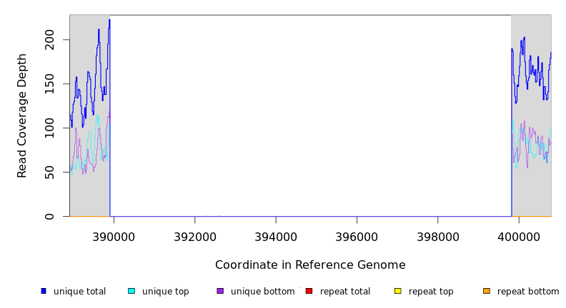 | seq id | start | end | size | ←reads | reads→ | gene | description | |||