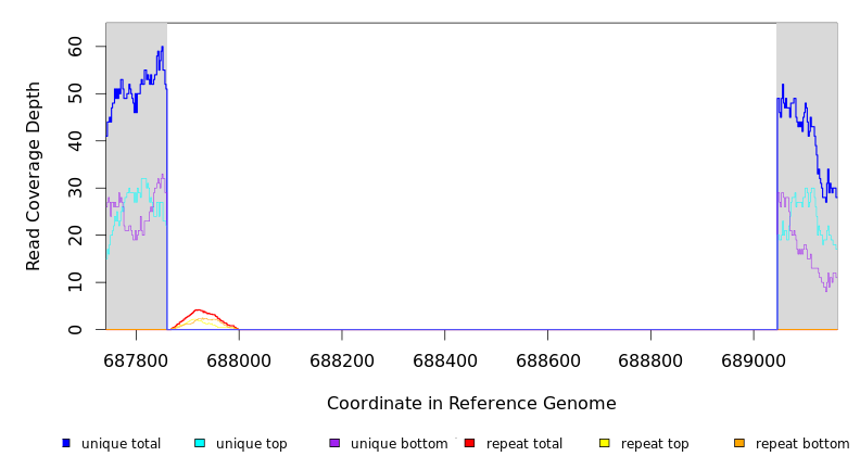| seq id | start | end | size | ←reads | reads→ | gene | description | |||