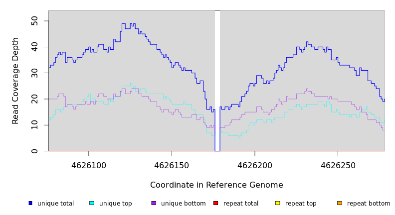 | seq id | start | end | size | ←reads | reads→ | gene | description | |||