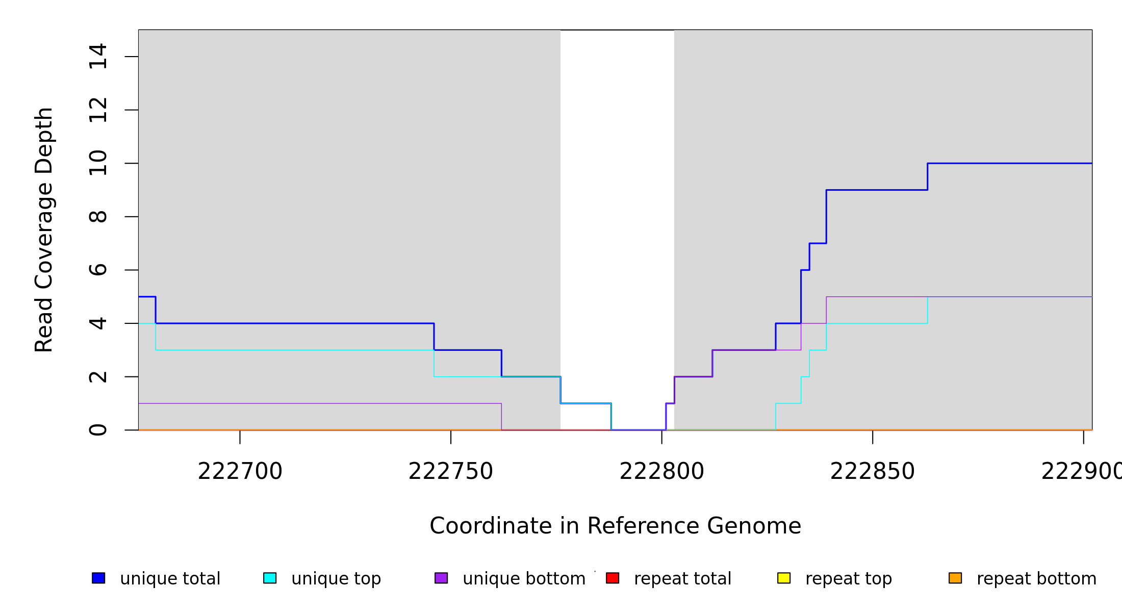 | seq id | start | end | size | ←reads | reads→ | gene | description | |||