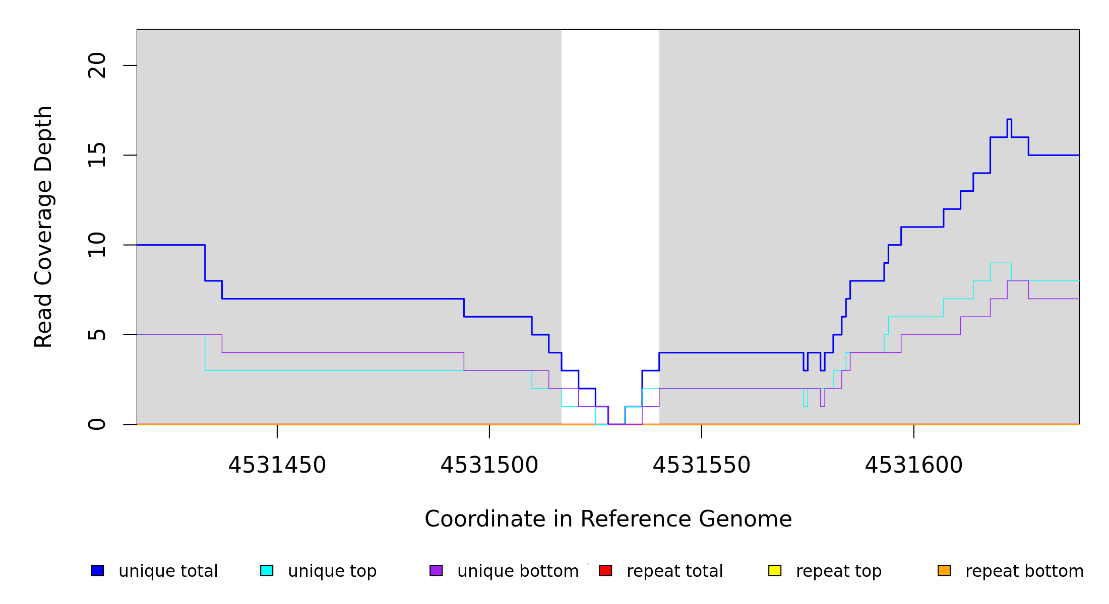 | seq id | start | end | size | ←reads | reads→ | gene | description | |||