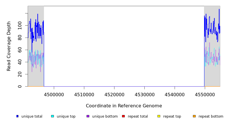 | seq id | start | end | size | ←reads | reads→ | gene | description | |||