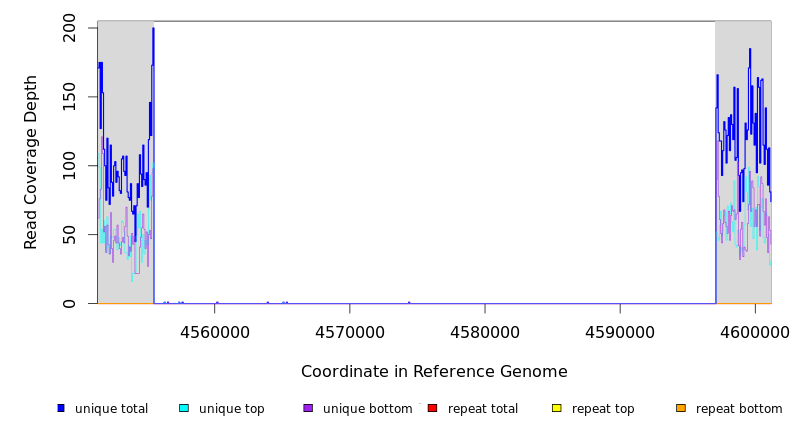 | seq id | start | end | size | ←reads | reads→ | gene | description | |||